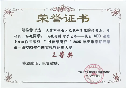 | 为增强师生安全意识,弘扬校园安全文化,学院鼓励师生积极参加由中国人力资源和社会保障出版集团举办的“技能雏鹰杯”2025年春季学期开学第一课校园安全图文视频征集大赛,学院学生纪鑫原、董佳兴、孙超的作品《关键时刻 守护生命——校园AED使用全攻略》荣获三等奖。  在指导教师陶媛、张子清、张琛的指导下,学院学生作品在全国462所技工院校提交的1063份作品中脱颖而出,进一步创新了安全教育形式,丰富了安全文化内涵,以专业技能展现校园安全的建设成效。 |