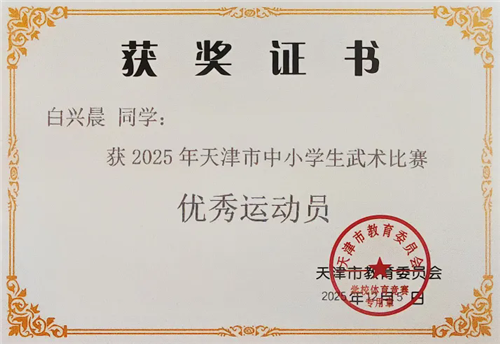| 学校荣获2025年天津市中小学生武术比赛团体总分第一名 |