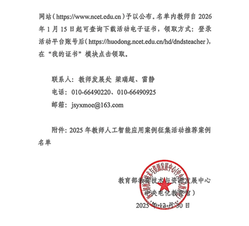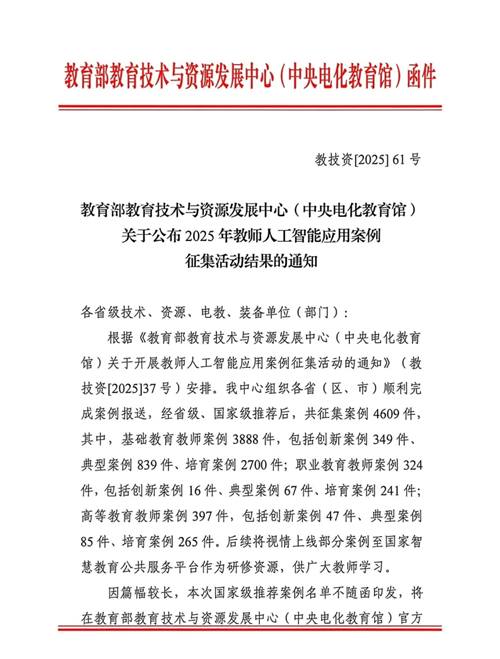 近日,教育部教育技术与资源发展中心(中央电化教育馆)公布了2025年教师人工智能应用案例征集活动结果,学校教师石剑飞报送的案例《“云端书卷,路上行知”——云-端-硬一体化AI教育平台的构建与应用》获评国家级职业教育创新案例。 ![]() ![]() ![]() 经省级、国家级推荐评审,石剑飞老师的创新案例入选了全国16件职业教育教师创新案例,充分彰显了学校在人工智能教育融合创新领域的实力。 一直以来,学校高度重视人工智能等新兴技术与教育教学的深度融合,积极搭建数字化教学创新平台,鼓励教师探索技术赋能下的育人新模式。此次获评国家级创新案例,是对学校教师专业能力与教育创新水平的高度认可,也是学校深耕职业教育数字化改革的重要成果。 未来,学校将充分发挥国家级创新案例的示范引领作用,持续培育优质教育教学创新成果,提升教育教学信息化智能化水平,为培养适应数字经济时代的高素质技术技能人才筑牢根基。 |
