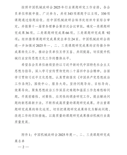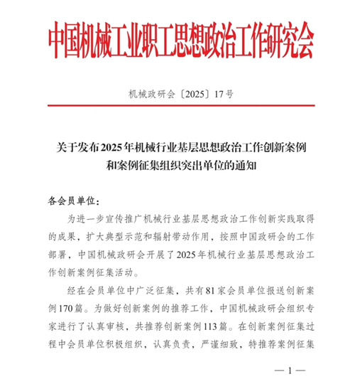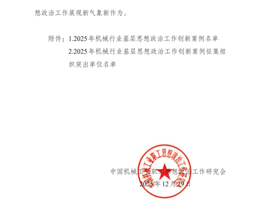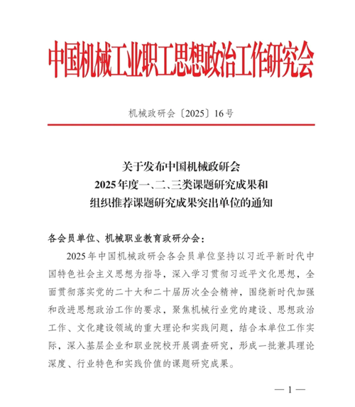 近日,中国机械工业职工思想政治工作研究会公布了2025年度一、二、三类课题研究成果和2025年机械行业基层思想政治工作创新案例评审结果,学院6项课题斩获佳绩,其中,2项课题荣获中国机械政研会2025年度一类课题研究成果,2项课题荣获中国机械政研会2025年度三类课题研究成果,2项课题荣获2025年机械行业基层思想政治工作创新案例。学院荣获中国机械政研会2025年度组织推荐课题研究成果突出单位、2025年机械行业基层思想政治工作创新案例征集组织突出单位。