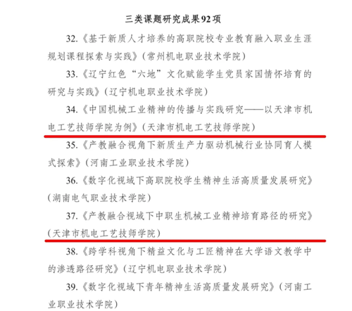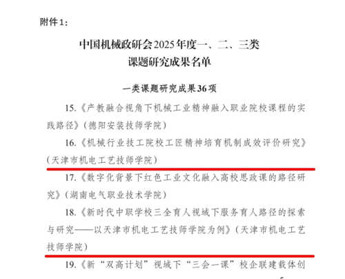 《中国机械工业精神的传播与实践研究——以天津市机电工艺技师学院为例》(课题组成员:王芊、邬聪聪、李淑丽、邓琪、冯晨旭、刘芳、杨婧、裴丽莎、郭淑英) 《产教融合视域下中职生机械工业精神培育路径的研究》(课题组成员:刘明、张静、郑德健、张海玲、任喆、卢晓辉、姚瑶、谢易辰) ![]()