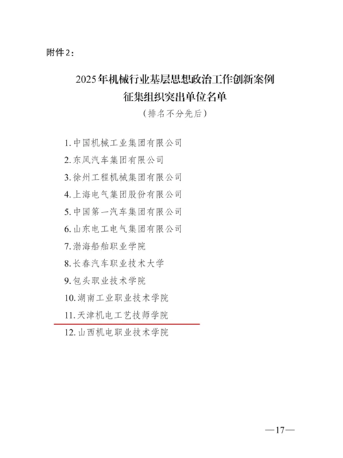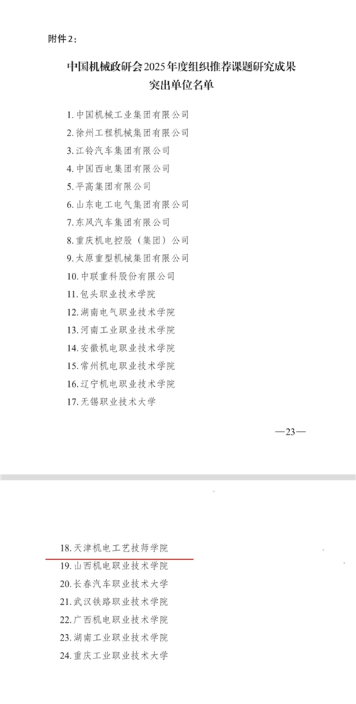 《根系到枝叶:就业导向型树形思政体系赋能工业机器人专业育才新路径》(课题组成员:方晓群、邢广莹、赵新萌) 《五维浸润·数字赋能——机械中职学校“服务育人+”思政工作创新实践》(课题组成员:陶媛、曾抗、焦昀) ![]() ![]() ![]() ![]() ✭学院荣获中国机械政研会2025年度组织推荐课题研究成果突出单位和2025年机械行业基层思想政治工作创新案例征集组织突出单位。 ![]() ![]() 学院始终将教师专业发展和能力提升置于关键地位,通过系统化的培养机制,持续提升教师的课题研究能力与专业综合素养,积极营造浓厚的学术氛围,鼓励教师深耕专业领域,并形成了一批具有实践应用价值与学术研究意义的高质量课题研究成果。同时,学院高度重视课题成果的转化与应用,推动其切实服务于教育教学改革、课程体系优化与实训模式创新。 下一步,学院将继续深化教师队伍建设,构建更为完善的能力提升支持体系,以课题项目研究反哺教育教学,着力促进课题研究与人才培养实践深度融合,引导教师在解决真实教育教学问题、回应产业技术变革中开展研究,培养出更多兼具高尚品德与精湛技艺,能够担当民族复兴大任的高素质技术技能人才。 |
